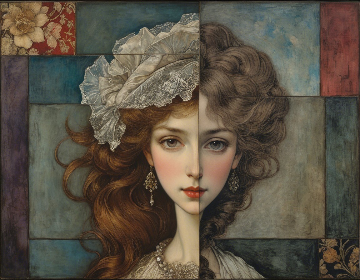 The image features a young woman with flowing dark hair adorned with a large flower. Her serene expression and pink cheeks are complemented by a colorful, patterned background.