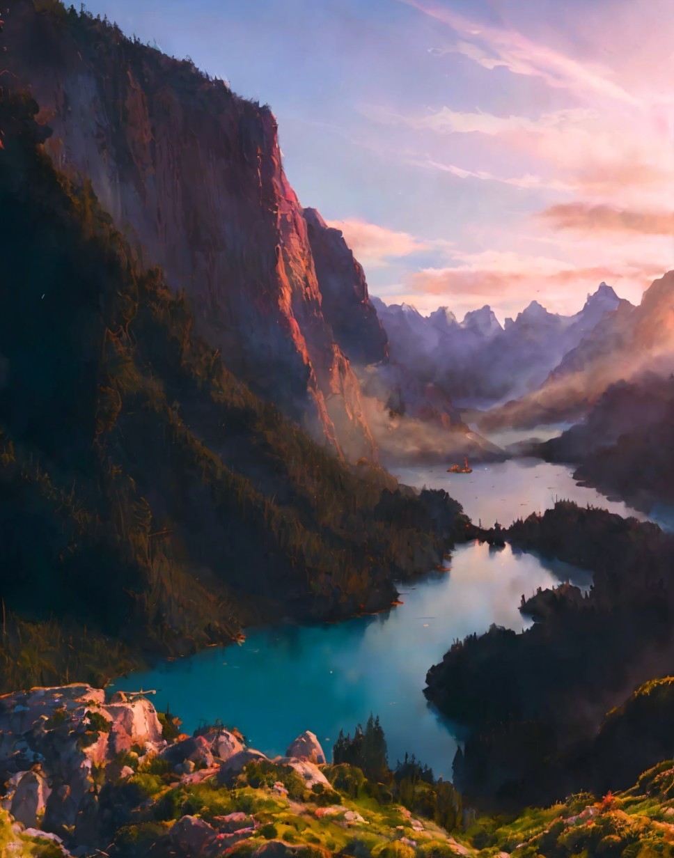A breathtaking landscape features a serene river winding through towering mountains, with soft, pastel hues in the sky. Lush greenery lines the banks, creating a tranquil, picturesque scene.