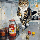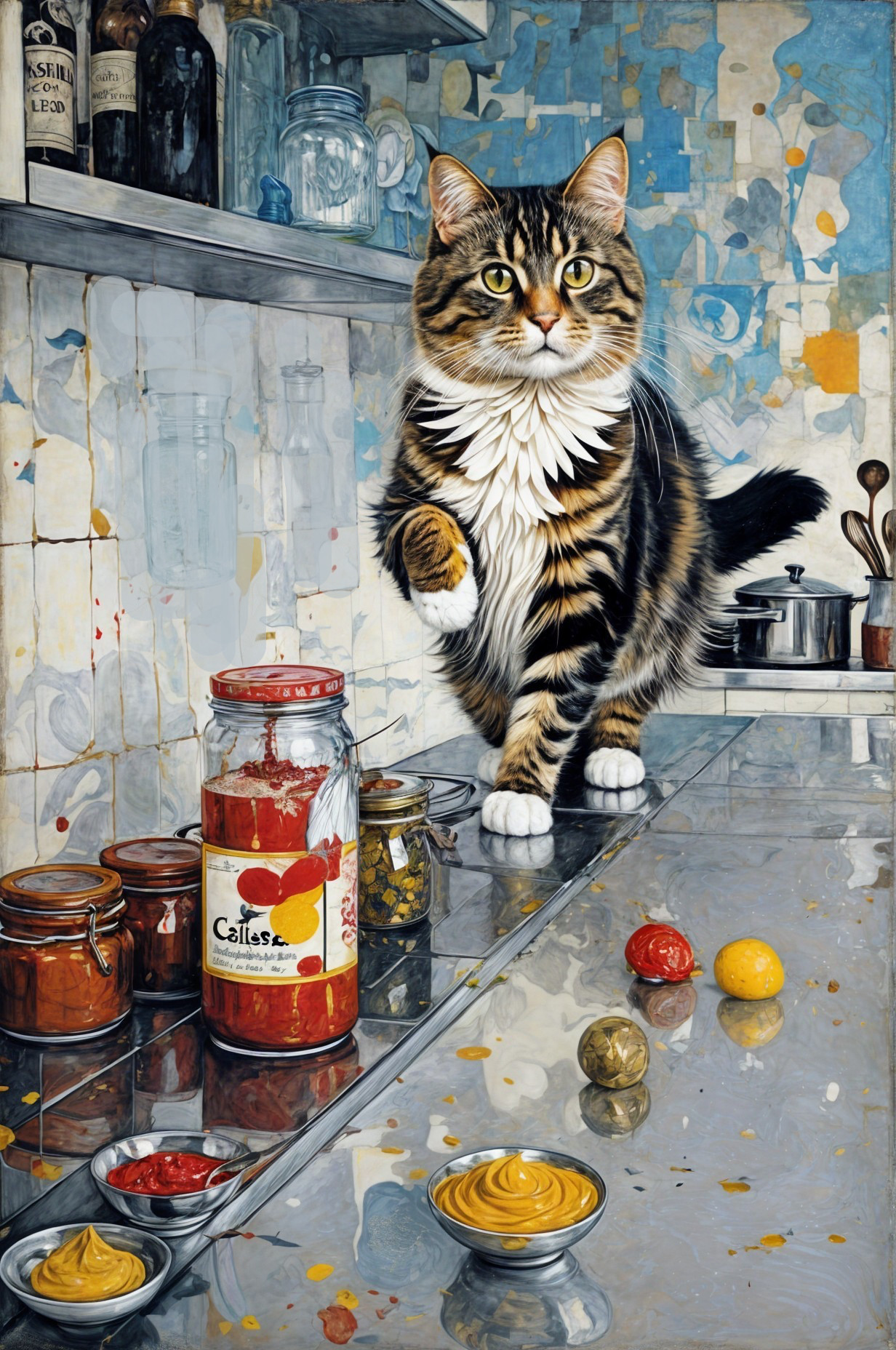 ((Christian Schloe, Tom Everhart, Cy Twombly, David Downton, El Anatsui, Philip Taaffe, Jan Toorop, Koloman Moser)) An abstract depiction of a scruffy little long haired cat chasing a mouse on top of a kitchen counter amidst a variety of food products, catsup bottles, a mustard jar.