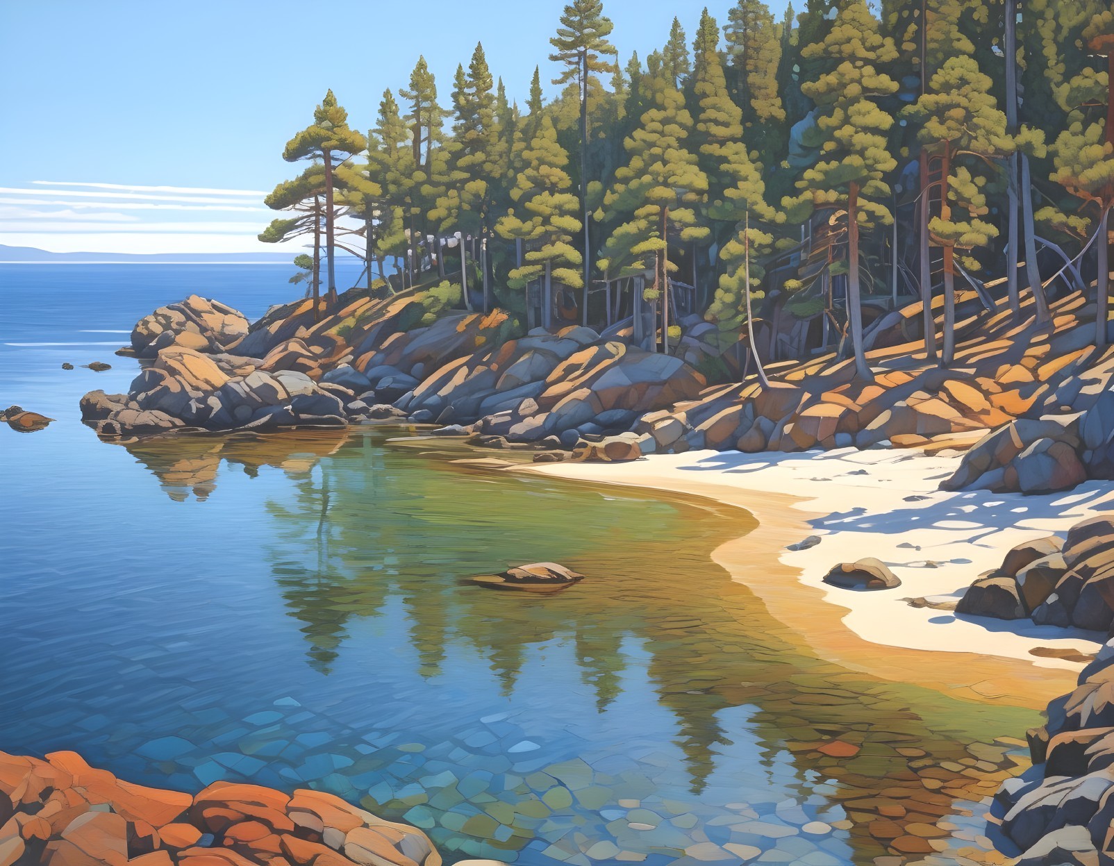 Tranquil Coastal Cove with Clear Waters and Lush Greenery