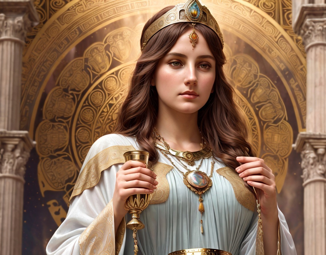 Regal Woman with Crown and Scepter in Ornate Setting
