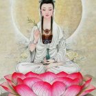 The artwork features a serene, ethereal figure adorned with ornate patterns and pastel colors. Surrounding her are smaller female figures, embodying harmony and beauty, set against a dreamy backdrop.