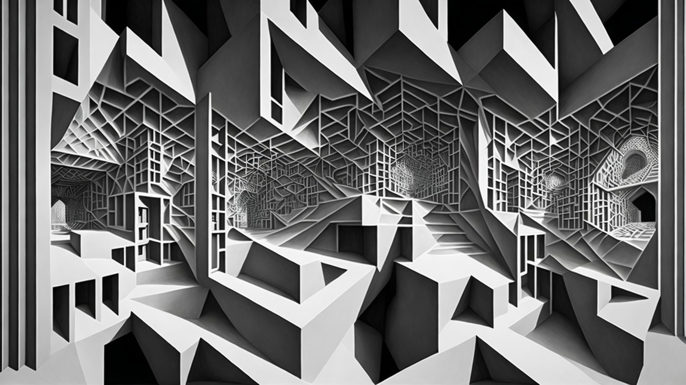The image features an abstract, geometric maze of white cubes and lines, creating an illusion of depth and complexity, with sharp angles and intricate patterns that suggest a surreal architectural space.