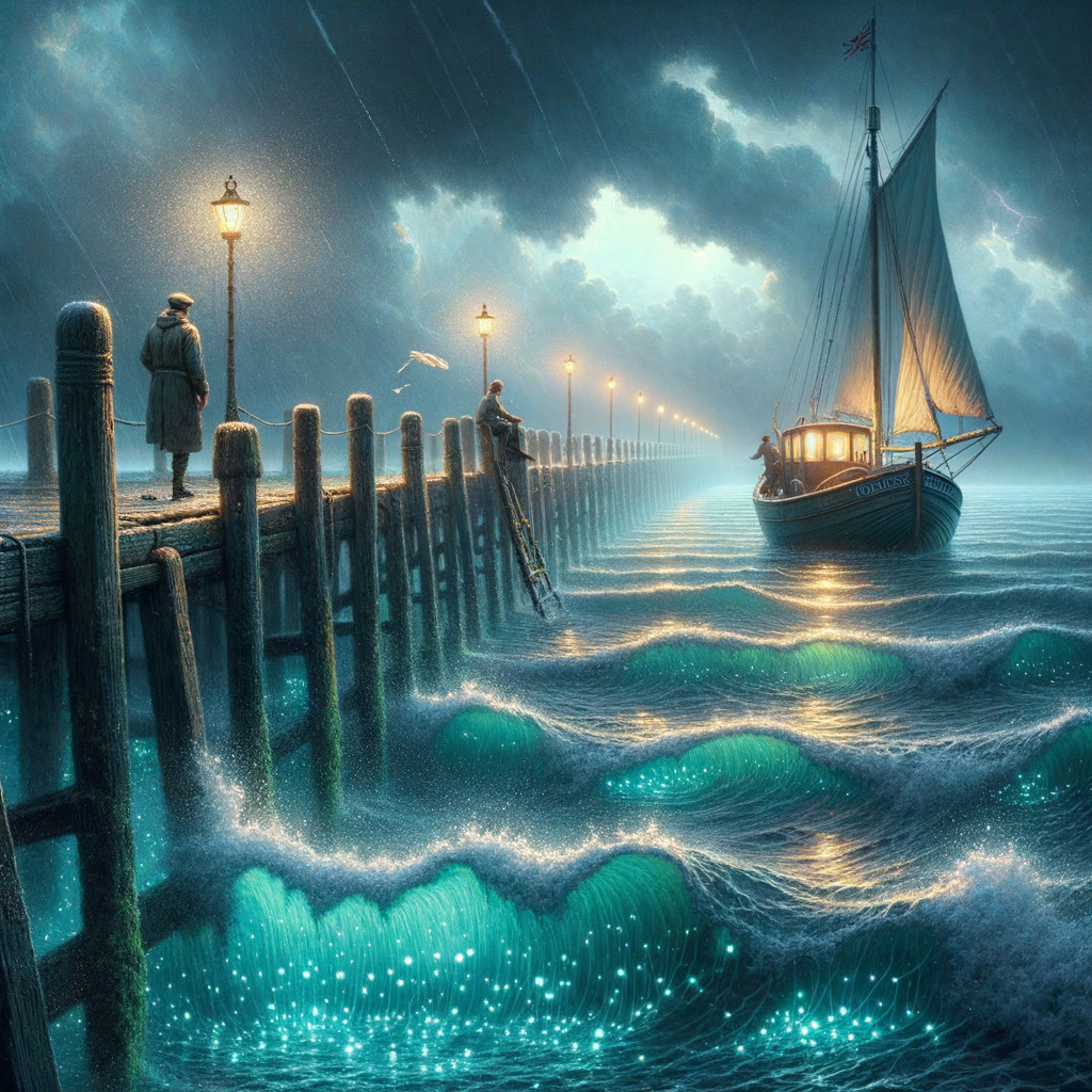 Enhance! Best quality image. less darks. at the end of the jetty, the boat tipped its riding lights in reflecting waves, a sailor stood silent at the helm. The breeze was rising and salt spray, they were sailing out, rocking on a swift sea, the water sliding about below the rough boat timbers, bioluminescent sea water charged with algae bloom.a small boat on the sea during a hurricane and lots of wind.