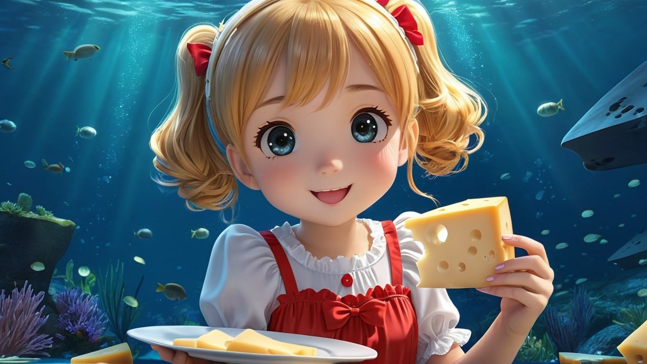 A whimsical scene unfolds as a charming girl in a cute anime nightgown gracefully holds a plate of Swiss cheese while submerged underwater, surrounded by colorful fish and vibrant marine life.