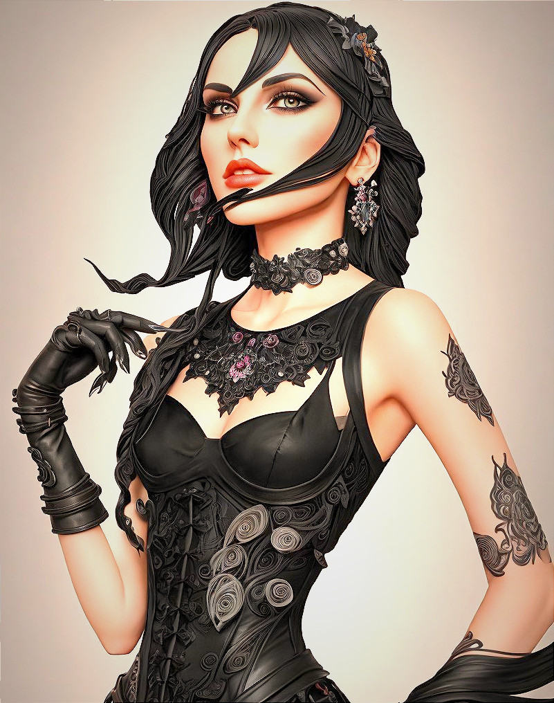 Detailed gothic elements, smooth dewy complexion, Other-worldly beauty & mystique