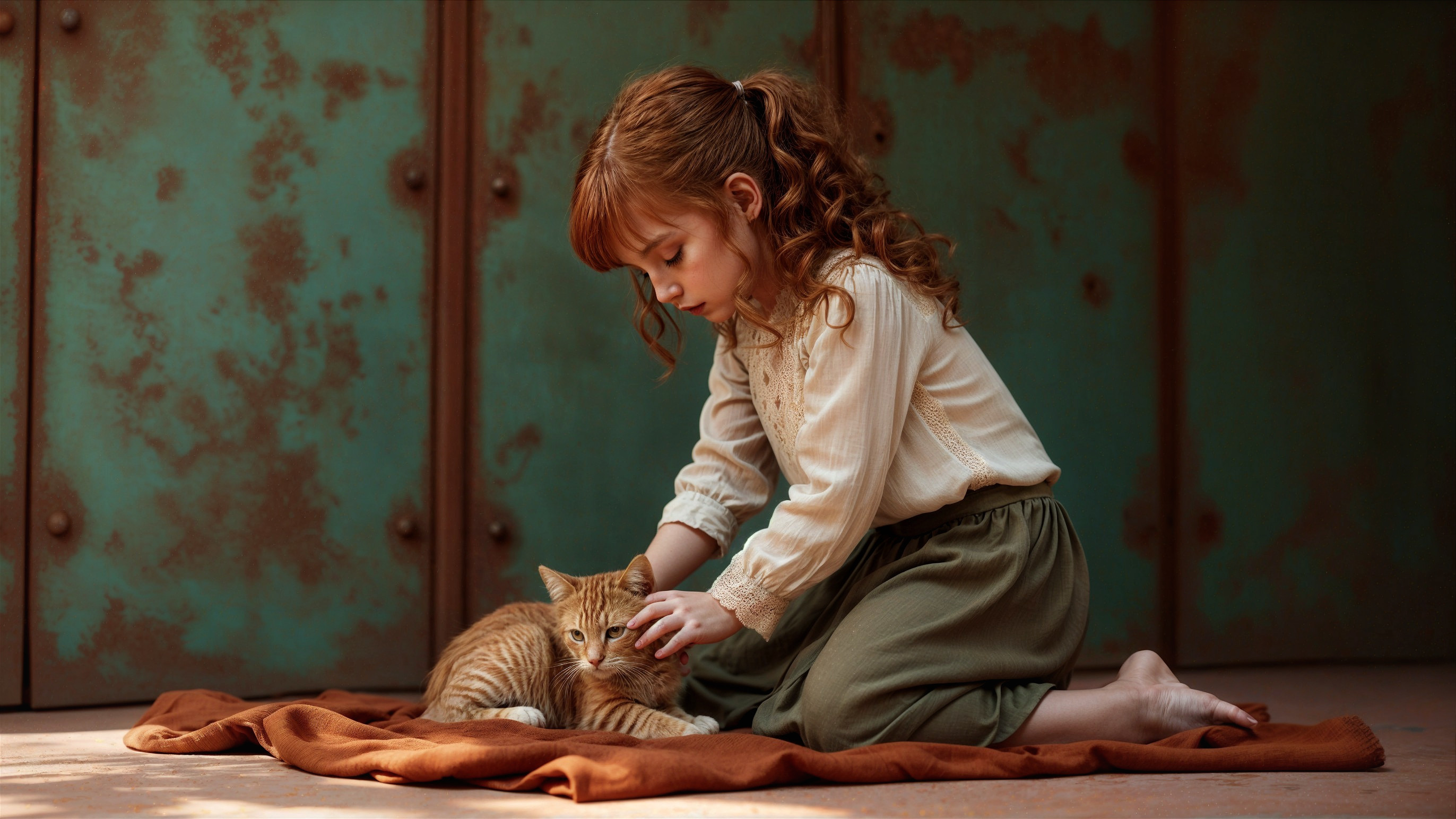 A young girl with curly red hair kneels on a soft orange blanket, gently petting a striped kitten in a rustic room with teal walls, creating a warm and heartwarming scene.