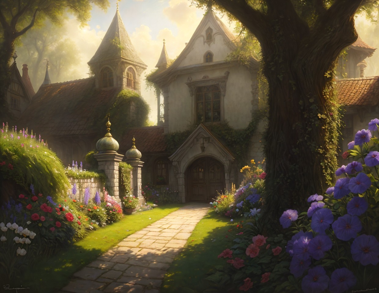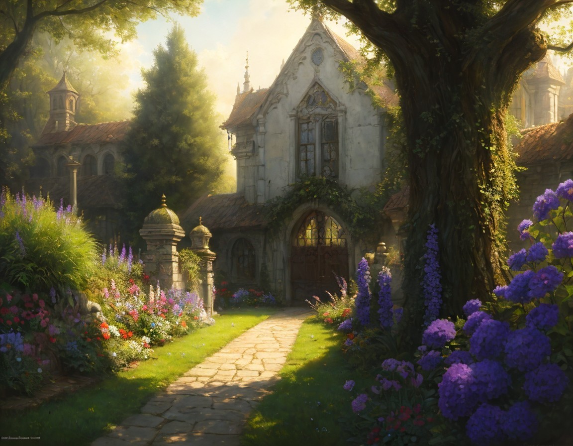 Prompt: "(((masterpiece))), The garden in the Wizard's Castle , in the style of Biedermeyer and Pastoral , artist Jean-Baptiste Monge , Eugène Delacroix , Rembrandt , Dmitry Levin"