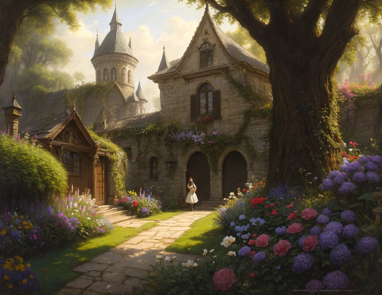 (((masterpiece))), The garden in the Wizard's Castle , in the style of Biedermeyer and Pastoral , artist Jean-Baptiste Monge , Eugène Delacroix , Rembrandt , Dmitry Levin