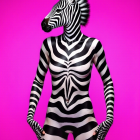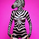 The image features a person in a full-body suit painted with zebra stripes, complemented by a zebra headpiece, set against a vibrant pink background, creating a striking and surreal visual effect.