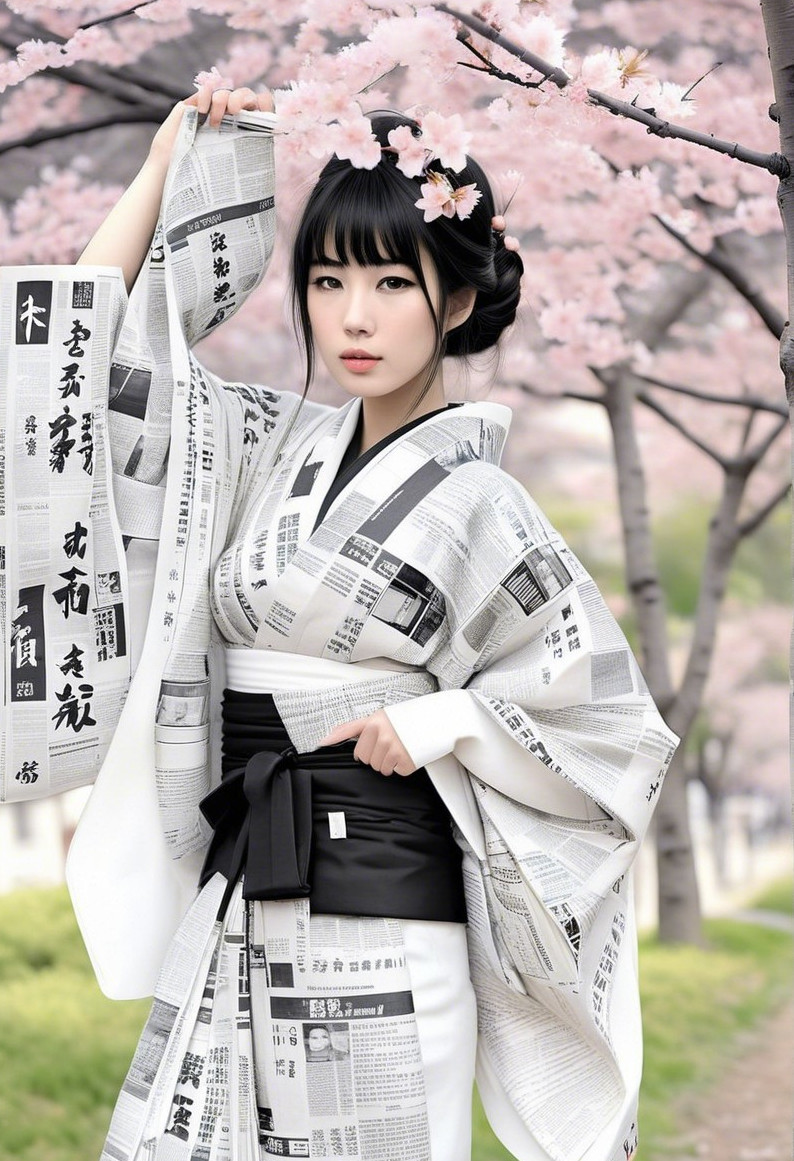 Japanese girl under a Sakura tree wearing a kimono made of black and white newspapers, Loui Jover style