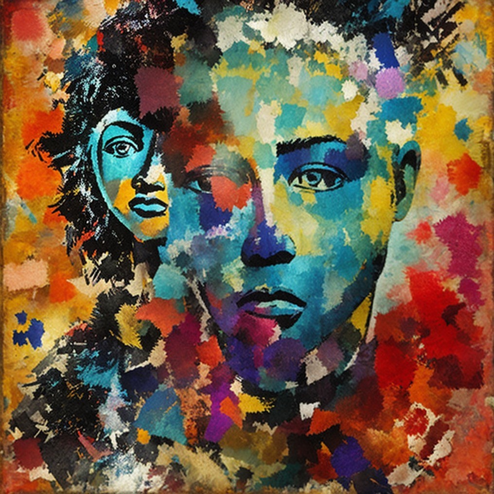 The image features vibrant, abstract faces blending into a colorful background. The use of vivid hues and textures creates a dynamic, emotive composition, emphasizing expression and depth.