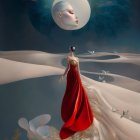 The artwork features a majestic figure in a flowing red gown amidst a dreamlike landscape, filled with celestial bodies, clouds, and whimsical architectural forms, creating a surreal and enchanting atmosphere.