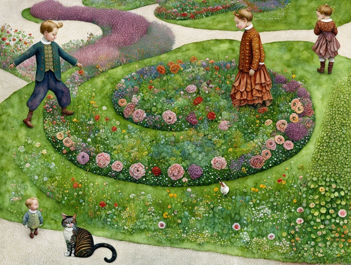 Style by Sam Toft, baroque spiral garden bed with flowers, a laughing boy, man and child trample around inside instead of walking on the paths, cat looks on.