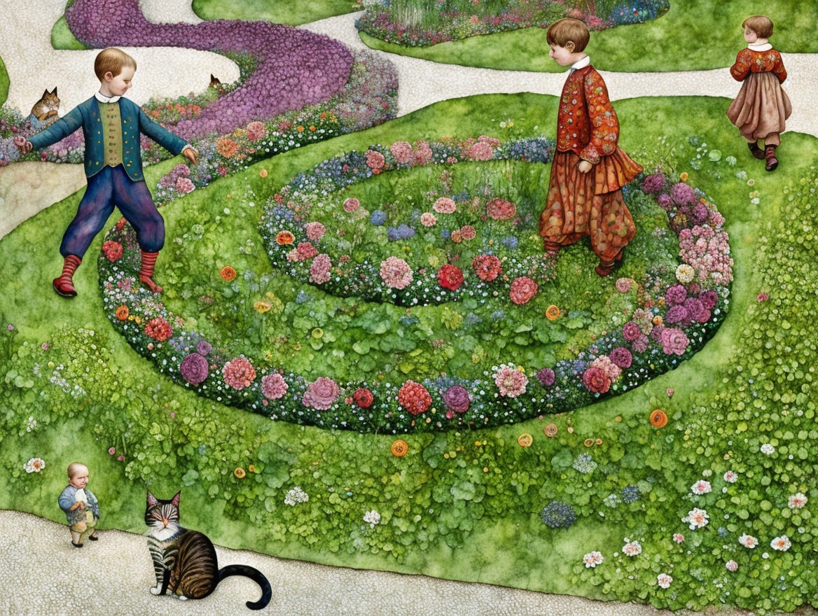 Prompt: Style by Sam Toft, baroque spiral garden bed with flowers, a laughing boy, man and child trample around inside instead of walking on the paths, cat looks on.