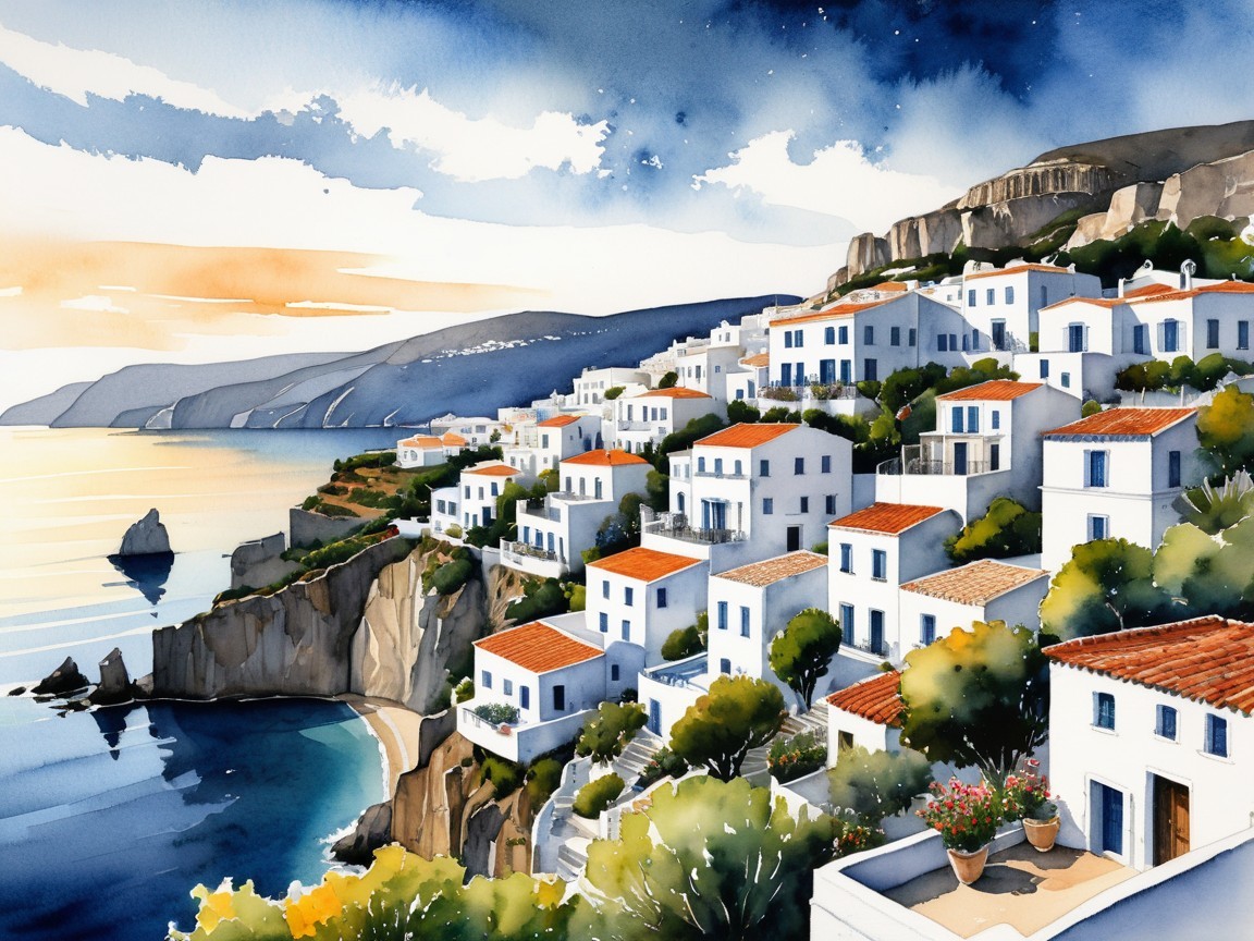 A picturesque coastal scene featuring whitewashed houses with red roofs perched on cliffs, overlooking a shimmering sea, under a dramatic sky with soft clouds during sunset.