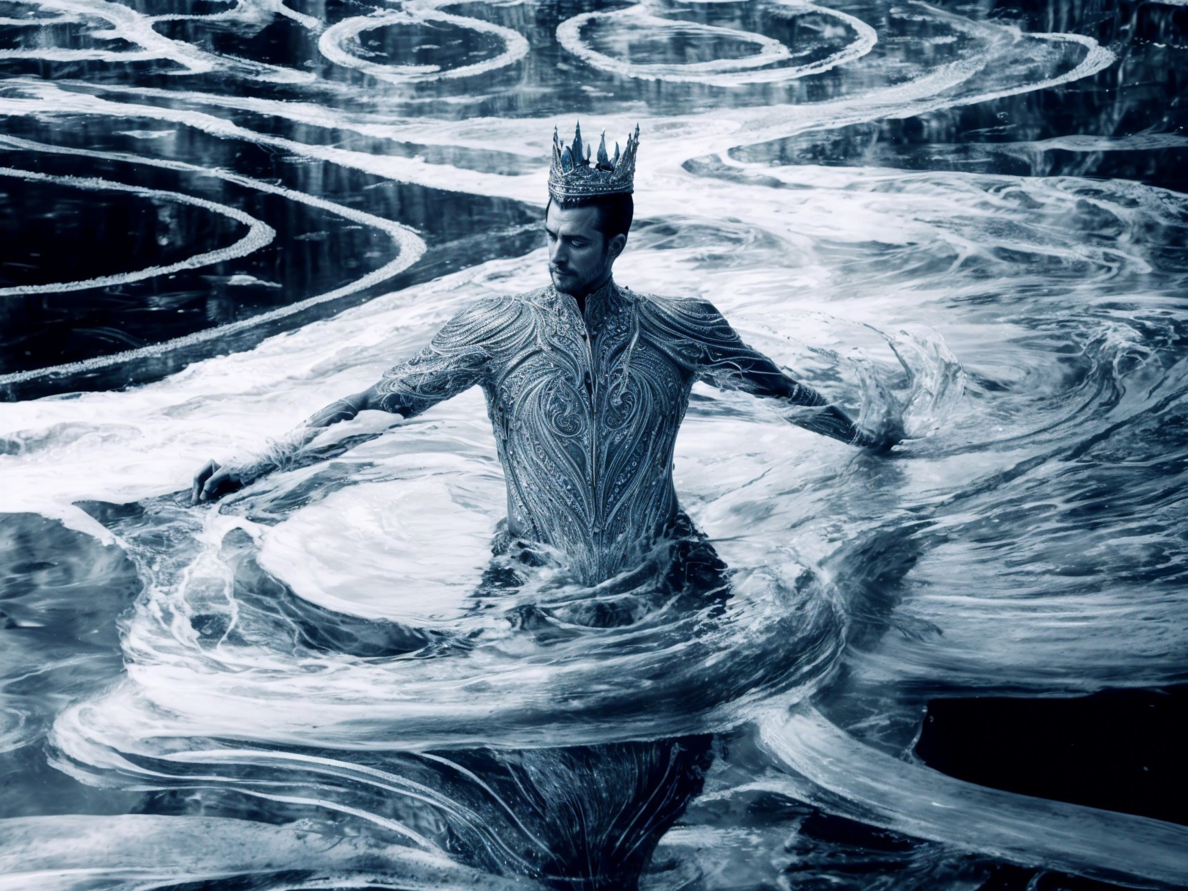 A regal figure with a crown stands in swirling waters, exuding power and majesty. The monochrome tones emphasize the dynamic movement and ethereal quality of the scene.