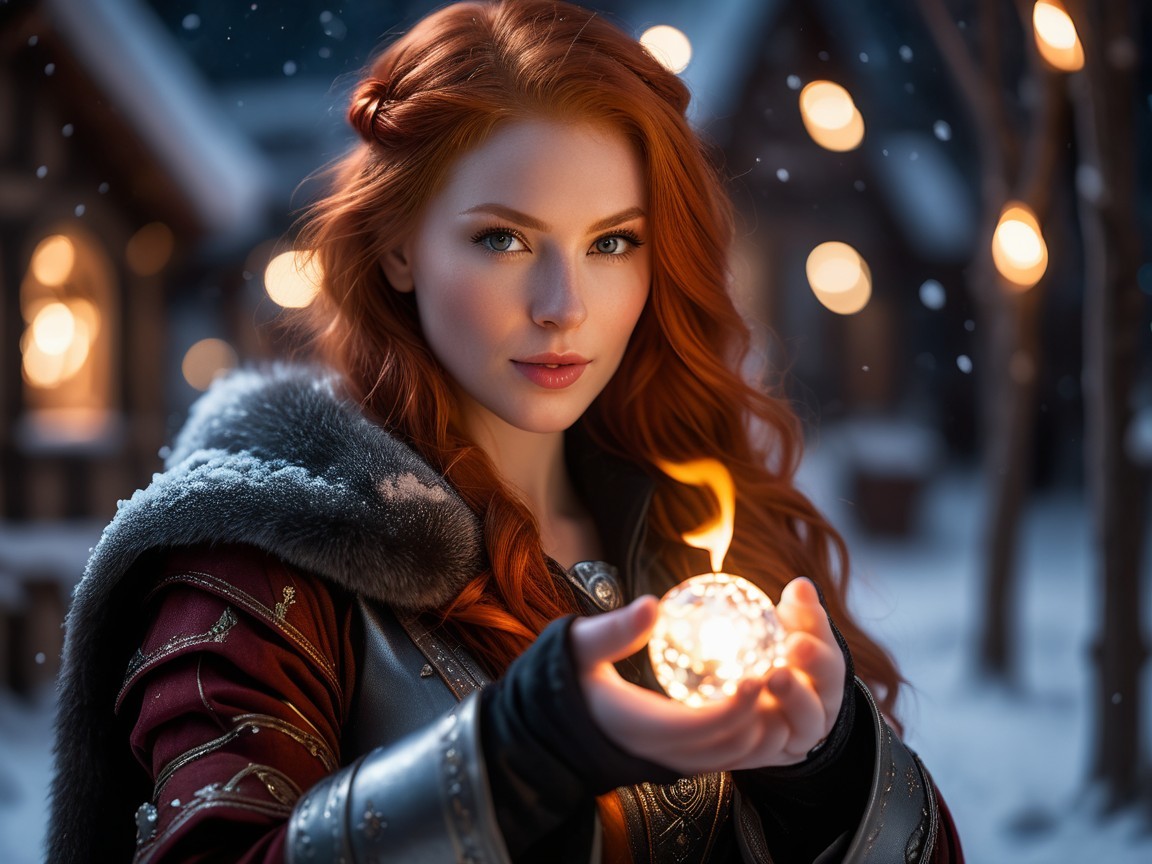 A woman with long red hair and medieval attire holds a glowing orb in a snowy village. Her expression is focused, surrounded by cozy wooden houses and softly falling snowflakes.