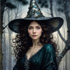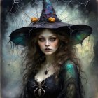 A mysterious witch with flowing red hair wears a spiderweb-themed hat adorned with pumpkins. Her haunting gaze is framed by intricate makeup, set against a foggy, enchanted backdrop.