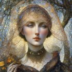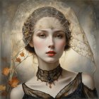 A young woman with soft features gazes intently, framed by an intricate veil and delicate webbing. Her attire is adorned with autumn leaves and ornate jewelry, creating a hauntingly beautiful ambiance.