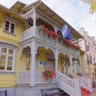 A charming yellow house adorned with intricate white lace details and vibrant red flowers, featuring EU flags. A welcoming staircase leads to the ornate door, complemented by a vintage streetlamp and a bench.
