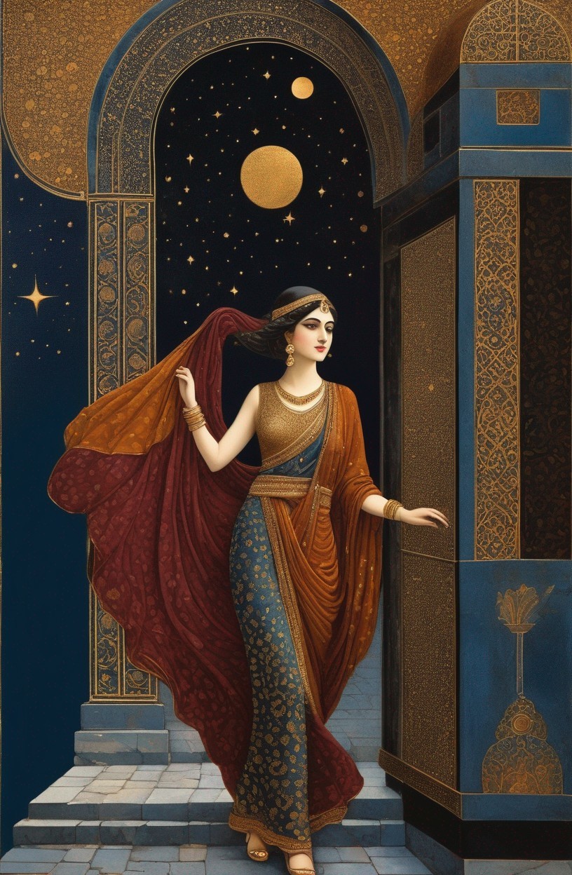 fashionable young woman on nocturnal street - 3rd century Persian miniature art . dark sky-blue and dark gold, energy-filled illustrations, delicate pointillism, bold stencil, celestial, screen printing, organic (Padmanabha
