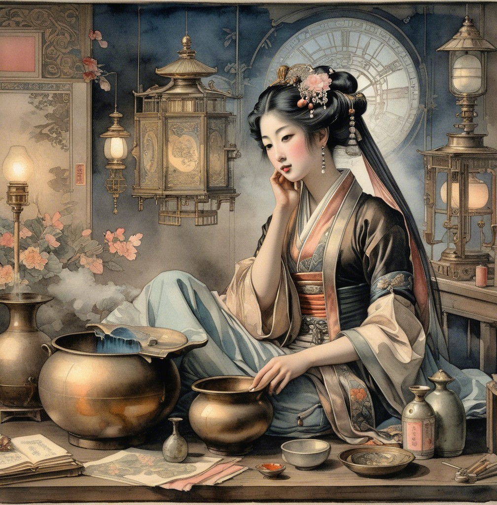 Japanese courtesan. , 3rd century Japanese miniature art. colored ink drawing, watercolor artwork on old withered paper, vintage, by Caravaggio, Fragonard, Anton Pieck, pale colors, high detail, intricately detailed, hyperdetailed volumetric lighting, art nouveau graphic steampunk ., whimsical, beautiful, poignant, touching. colors blush bronze, black. soft watercolor extra water in magical realism by Annigoni, Egon Schiele, Milo Manara, Botticelli, Catrin Welz-Stein, Jean Metzinger, Klimt, perfect eyes, perfect handsface, highly detailed, complementary colors, hyper detailed. Watercolor and ink splatter, dynamic pose, dark blue background, unreal engine, alphonse mucha, global illumination, detailed and intricate environment Beautiful woman in the style of Pino Daeni Dorota Piotrowiak Edward Gorey, junji ito, klimnt , gold leaf color, silver leaf color beautiful dynamic lighting high definition hdr * Random prompt award winning Max Ernst ultra detailed 4K 3D Texture