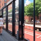 A person in a vibrant, colorful outfit walks past a store with elaborate, fiery artwork on the windows. The scene is lively and artistic, set against an urban backdrop.