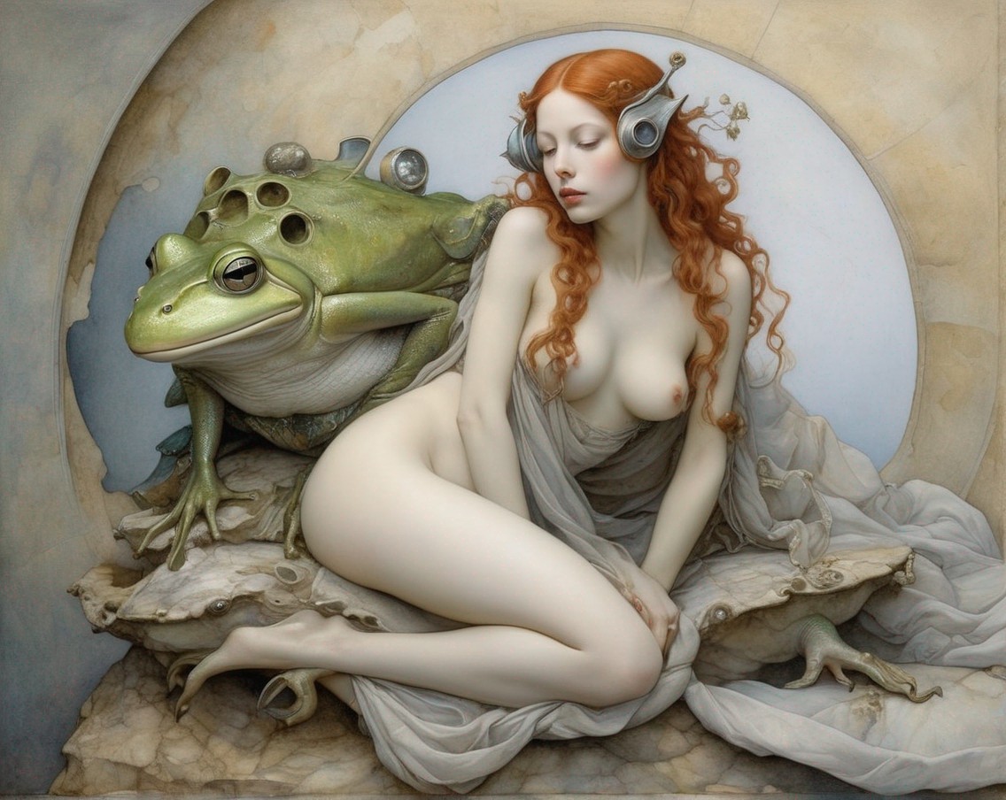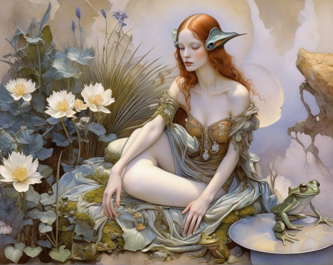 A woman with otherworldly attire, resembling a sea creature, surrounded by a celestial backdrop.