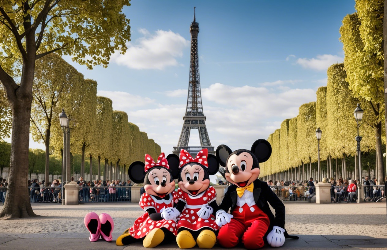 Mickey Mouse, Minnie Mouse, and Minnie's twin sister, Melanie sit together in front of the Eiffel Tower, surrounded by lush trees and a lively crowd enjoying the scene.
