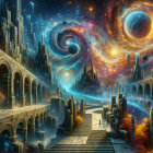 foreground features ancient, ornate structures made of weathered stone with intricate carvings, archways, and columns. A curved stone staircase leads upwards towards these architectural marvels. The midground showcases a series of towering spires and jagged towers covered in autumnal foliage, creating a sense of depth and continuity. A winding path, illuminated by a glowing blue light, winds through the scene. The background is dominated by a vast starry sky filled with vivid celestial bodies, including a prominent planet emitting a bright yellow glow on the left side. Another planet glows with electric blue energy near the top right corner. Scattered throughout are countless stars of varying sizes and colors, creating a mesmerizing cosmic backdrop. Dominating the upper left quadrant is a large, translucent crescent-shaped planet or moon, surrounded by swirling patterns of fire orange, deep red, and amber yellow hues, transitioning into cool blues and purples. This celestial body serves as a portal to another realm. To its right, a majestic, mystical creature resembling a wolf or dragon emerges from the cosmos, its body adorned with intricate swirls, spirals, and geometric patterns in electric blue, neon purple, and white. Its fur blends seamlessly into the cosmic environment, giving it a luminescent quality that suggests interstellar travel. On the left side, a large female figure's profile is visible, her face serene and contemplative, gazing downward. She has flowing silver hair intricately woven with elaborate designs, and wears an ornate crown embellished with vibrant crystals, gems, and swirling patterns in shades of blue, purple, pink, and gold. Her attire is richly decorated with symmetrical, swirling patterns in matching colors.