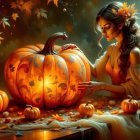 A young woman with long hair leans beside a carved pumpkin, featuring a spooky face. The scene is cozy, with candlelight and autumn leaves, creating a warm, festive Halloween atmosphere.