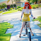 A stylish woman with bright red hair and oversized sunglasses rides a vintage bicycle. She wears a shimmering yellow dress and blows a bubble gum bubble, set against a vibrant garden backdrop.