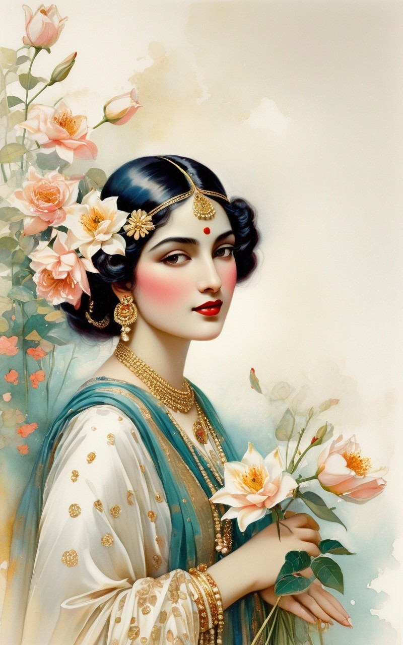 , colored ink drawing, watercolor artwork on old withered paper, vintage, by Caravaggio, Fragonard, Anton Pieck, pale colors, high detail, intricately detailed, hyperdetailed volumetric lighting, art nouveau graphic steampunk ., whimsical, beautiful, poignant, touching. colors indigo, gold, rust, burgundy, black. soft watercolor extra water in Art Deco by Annigoni, Egon Schiele, Milo Manara, Botticelli, Catrin Welz-Stein, Jean Metzinger, Klimt, perfect eyes, perfect handsface, highly detailed, complementary colors, hyper detailed. Watercolor and ink splatter, dynamic pose, dark blue background, unreal engine, greg rutkowski, loish, rhads, beeple, makoto shinkai and lois van baarle, ilya kuvshinov, rossdraws, tom bagshaw, alphonse mucha, global illumination, detailed and intricate environment Beautiful woman in the style of WALTER MARTIN BAUMHOFER