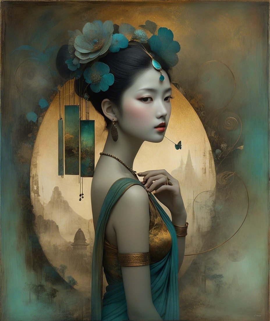 A serene portrait of a woman in traditional attire with bold turquoise accents. Delicate flowers adorn her hair, while a soft, mystical landscape softly frames her elegant profile.
