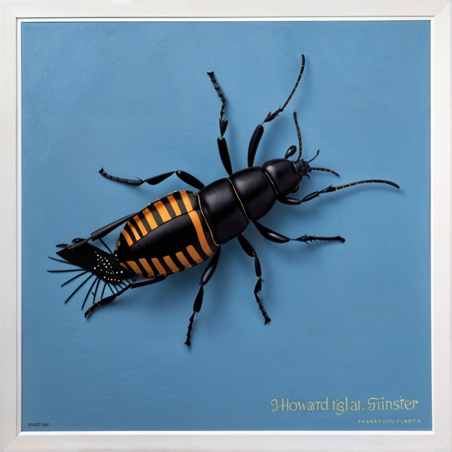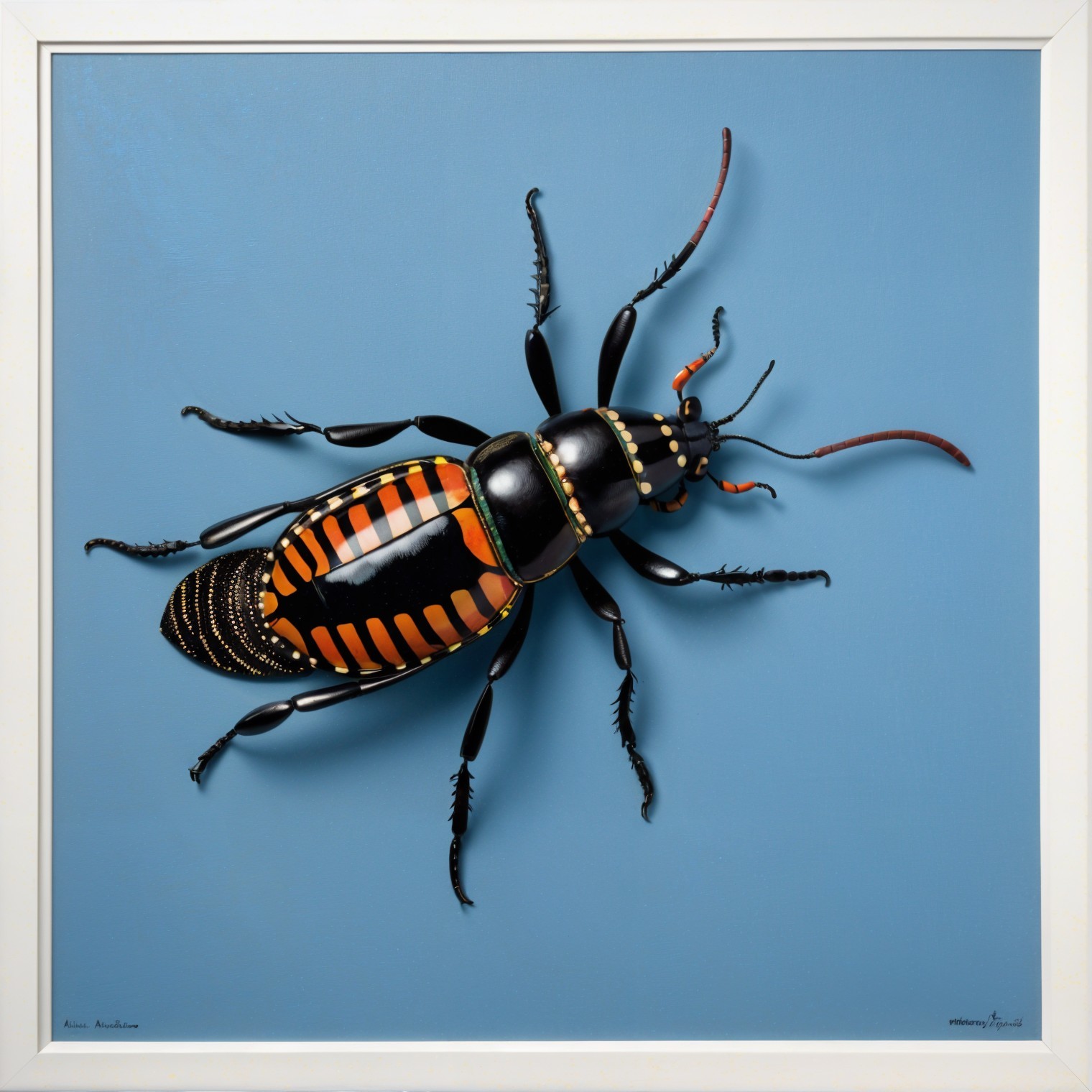 The image features a large, intricately detailed beetle mounted against a soft blue background. Its vibrant colors, including black, orange, and white stripes, create a striking visual contrast.