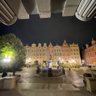 A vibrant, illuminated square features a central fountain surrounded by charming, historic buildings. Café tables are set outdoors, creating a lively, romantic evening atmosphere.