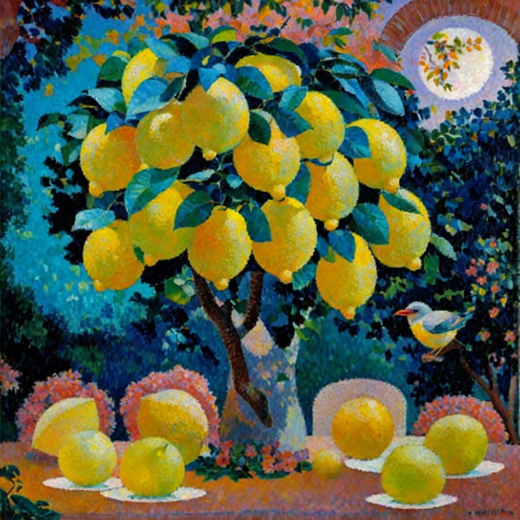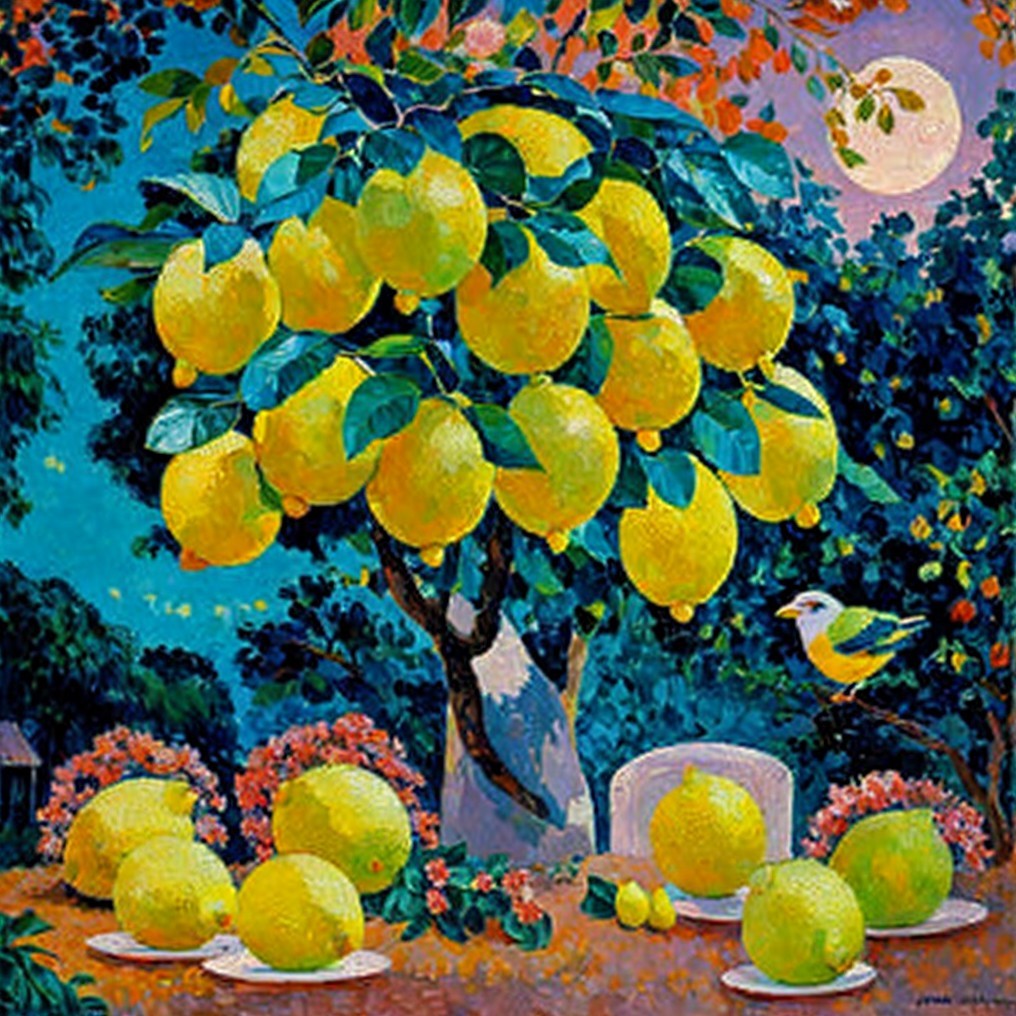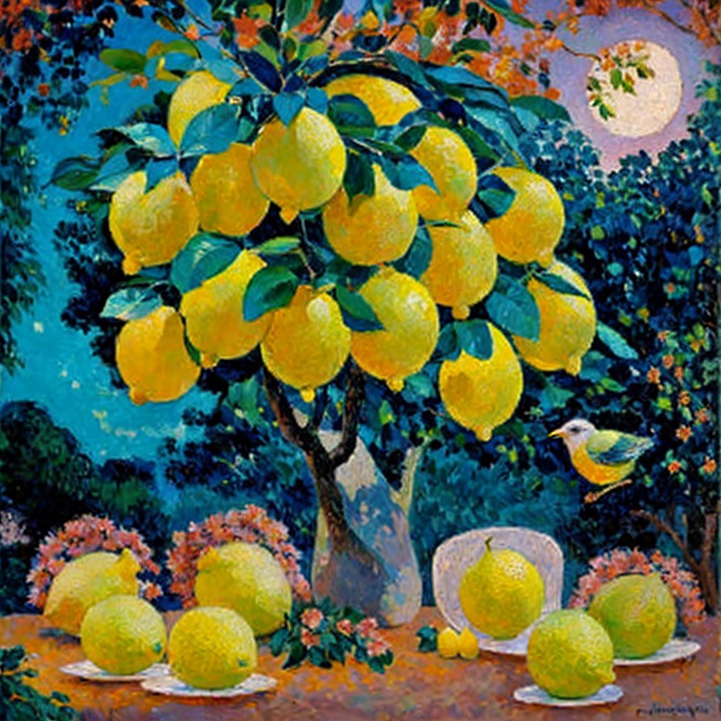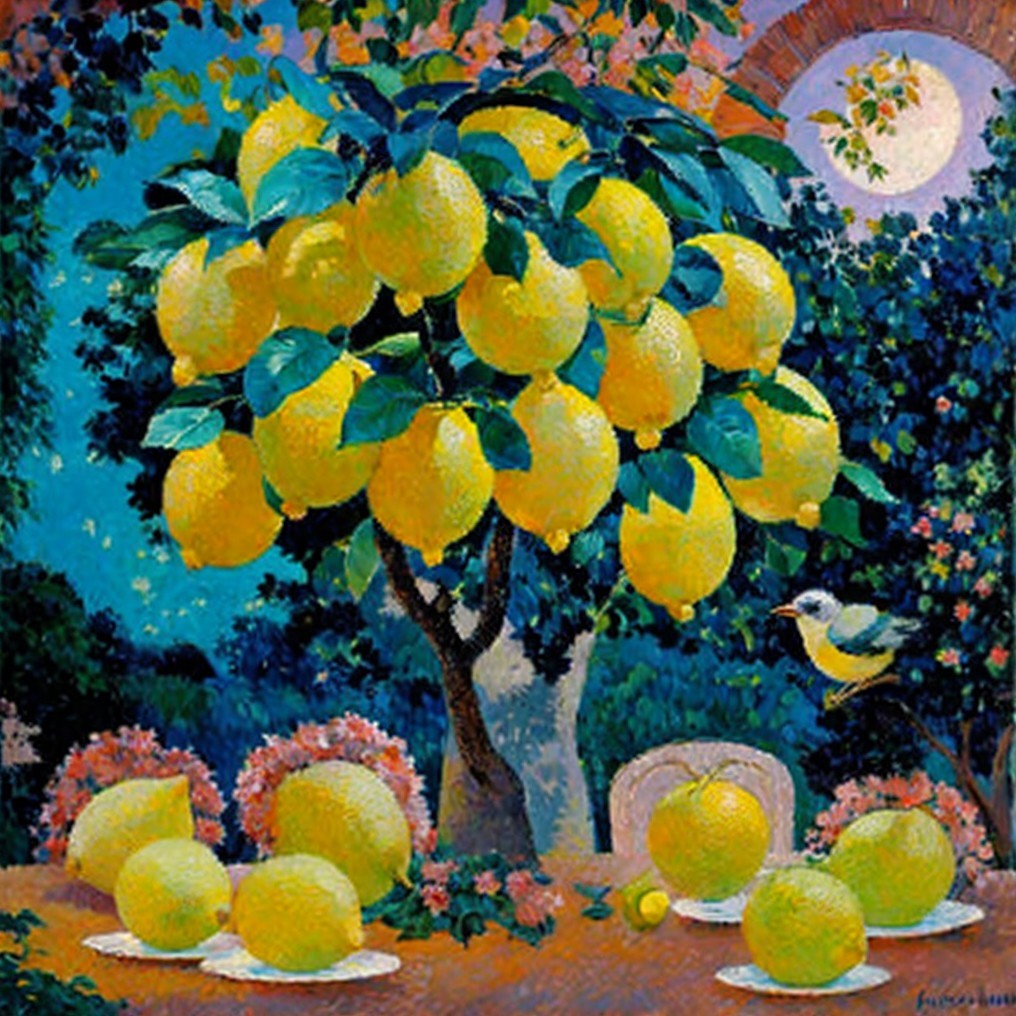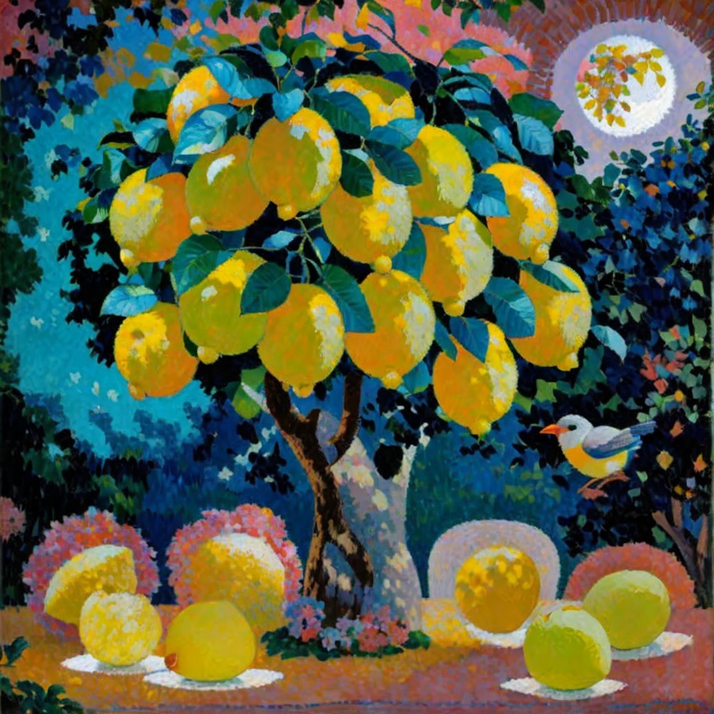 A lemon tree ripens under silver light, vibrant against deep cobalt foliage. Radiant yellows balance with cool blues and warm blossoms, capturing both nature’s abundance and poetic mystery in a modern luminous rhythm.