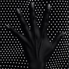 A silhouette of a hand against a backdrop filled with white dots on a black surface, emphasizing contrast and texture. The hand's elegant shape showcases manicured gray nails.