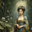 Young Woman in Moonlit Forest with Lotus Flowers