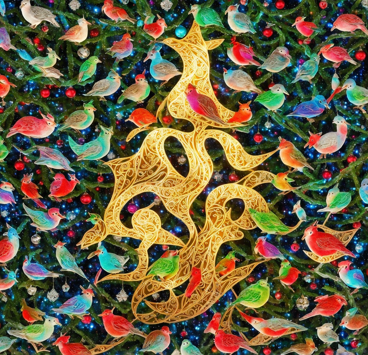 + Prompt:Beautiful christmas tree, on frozen pond, decorated with motifs of miniature colorful animals:kangaroo, galah bird, koala, anteater, wombat of animals, simple, beautiful, extremely detailed, highly intricate zentangle patchwork in the style of Teresa Silva, velvet starry night sky. frost, snow, white landscape, surreal