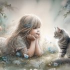 A gentle scene depicts a young girl with flowing blonde hair lying on the grass, gazing lovingly at a curious gray tabby cat. Surrounding them are delicate flowers and soft light, creating a serene atmosphere.