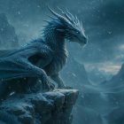 A majestic, white dragon perches on rocky terrain, surrounded by snow-capped mountains. A serene, icy lake reflects the cloudy sky, evoking a sense of grandeur and mystery in the wintry landscape.