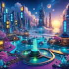 A serene scene showcases a tranquil waterfront with a vibrant city skyline at dusk. Cherry blossoms frame a pagoda, while colorful fountains and moons illuminate the peaceful atmosphere.