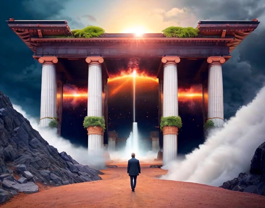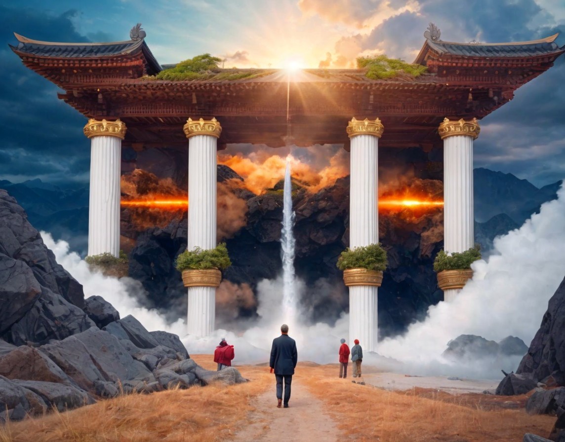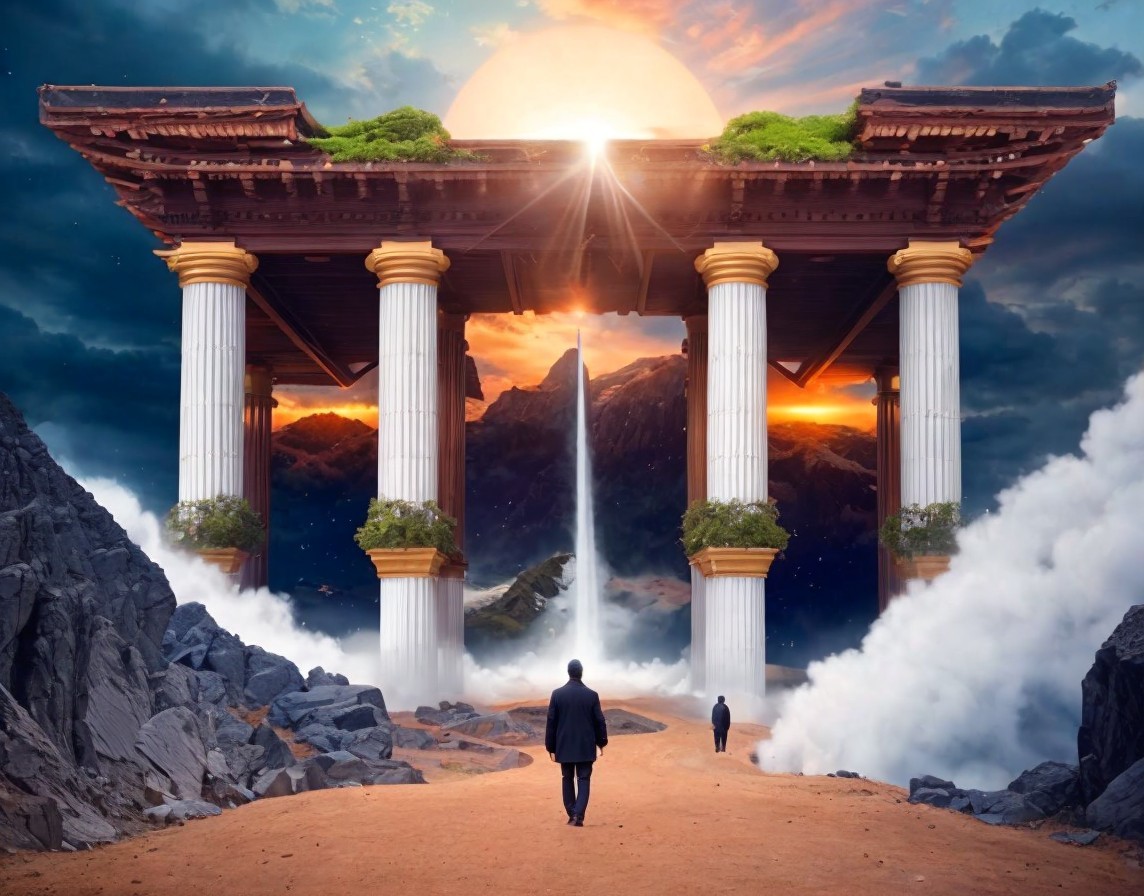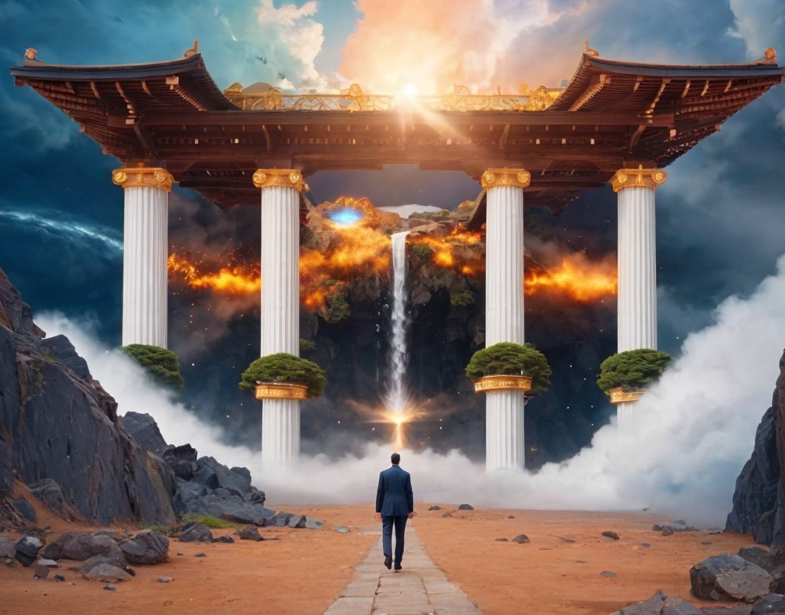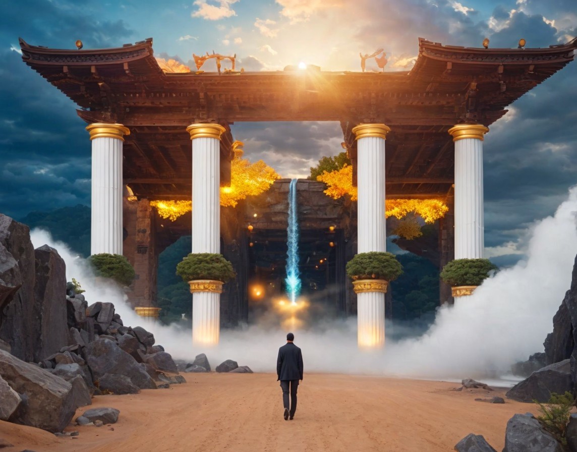 A person stands before an ancient, grand temple with towering columns, looking towards a waterfall and mountains bathed in golden sunlight.