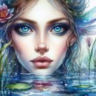 Fairy, ethereal woman emerges from calm waters, adorned with flowers and surrounded by butterflies and insects, radiating a magical, enchanting aura. Her captivating eyes draw you in.