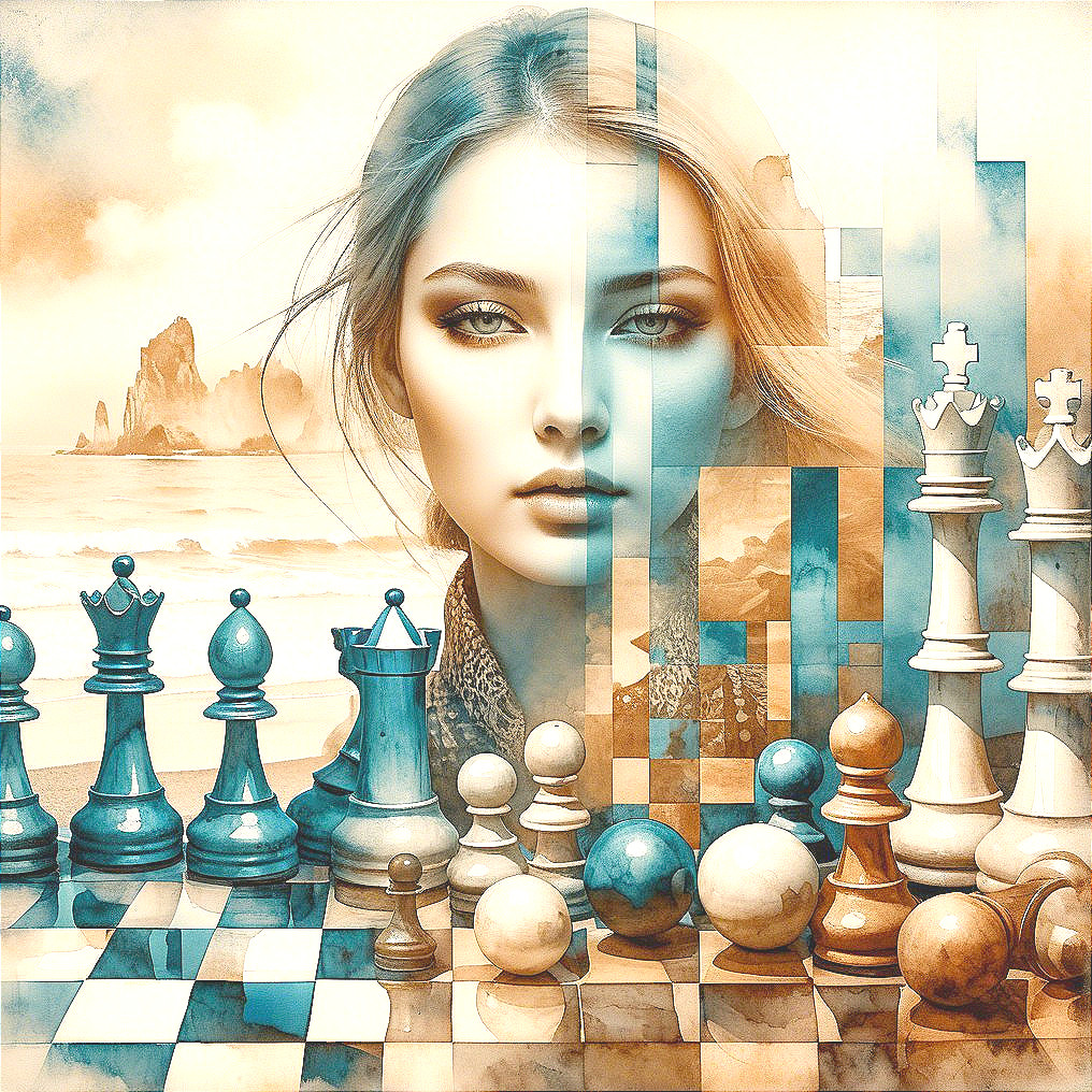 An artistic blend of a woman's face and a chessboard, symbolizing strategy and intellect. The color palette features soft blues and earthy tones, evoking a serene coastal atmosphere.
