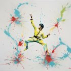 A martial artist in a vibrant yellow outfit strikes a dynamic pose with a staff, surrounded by colorful splashes of paint, creating a lively and energetic composition.