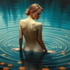 A serene scene portrays a woman in a tranquil pool, surrounded by lily pads. Her back is turned, and ripples create a calming effect in the water, enhancing the peaceful atmosphere.