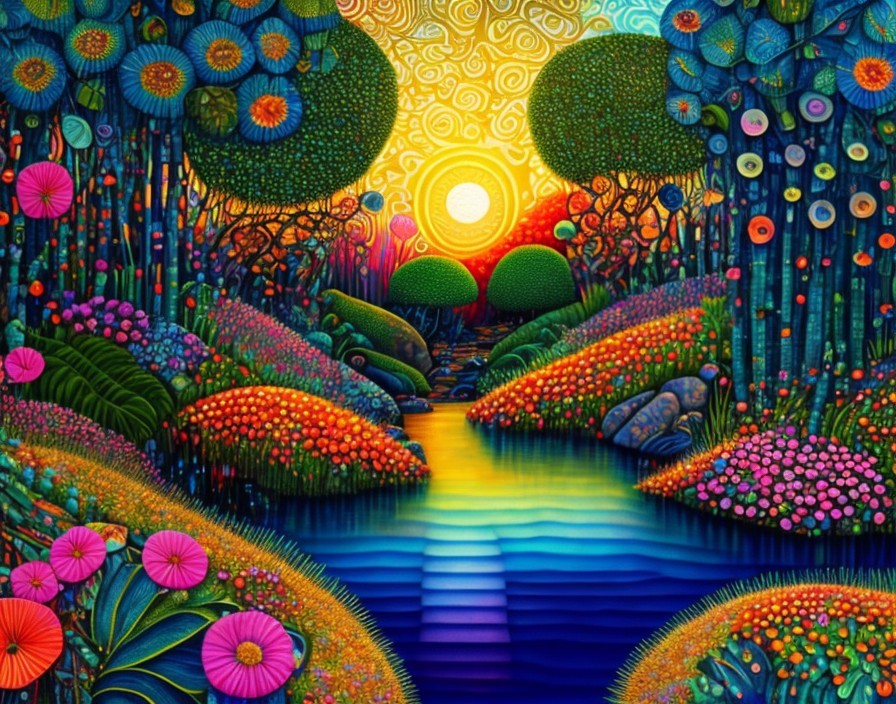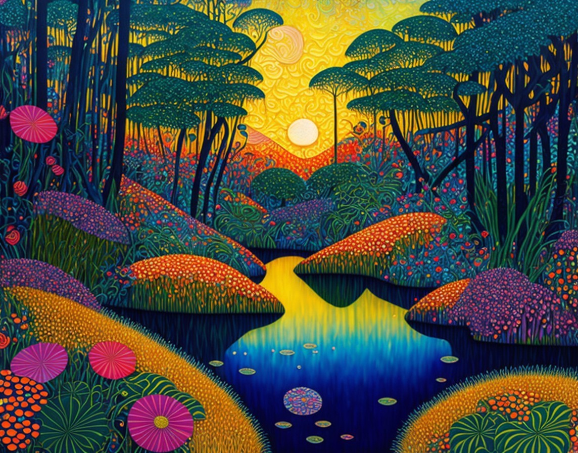 A vibrant, stylized painting of a forest with a river at sunset, featuring rich colors and decorative patterns on flora.
